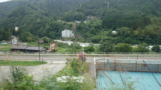 JR中央本線、車窓から木曽川を望む 対岸には「関西電力 桃山発電所」(長野県木曽郡上松町) |